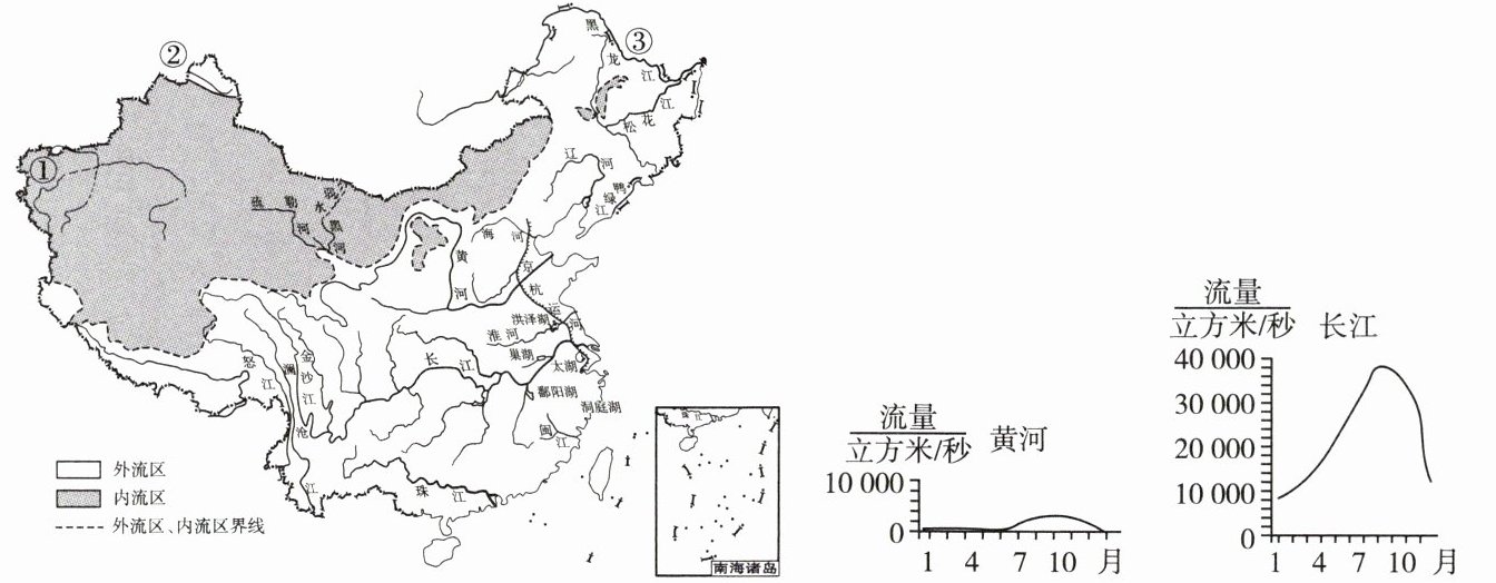 16. 读我国内流区、外流区主要河流分布示意图和长江、黄河年径流量变化曲线图,回答下列问题。