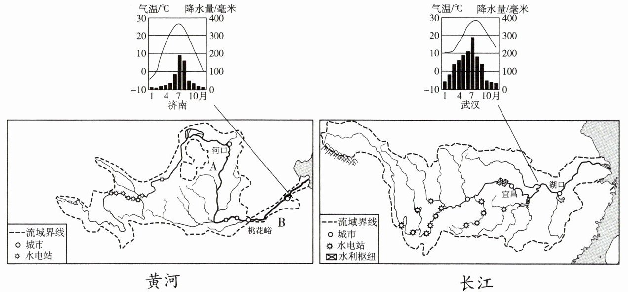 (1)长江、黄河都是我国的母亲河,但两条河流差异较大。请结合图中济南和武汉的气候资料图,比较长江、黄河主要的水文特征(流量、汛期、结冰期)差异。
