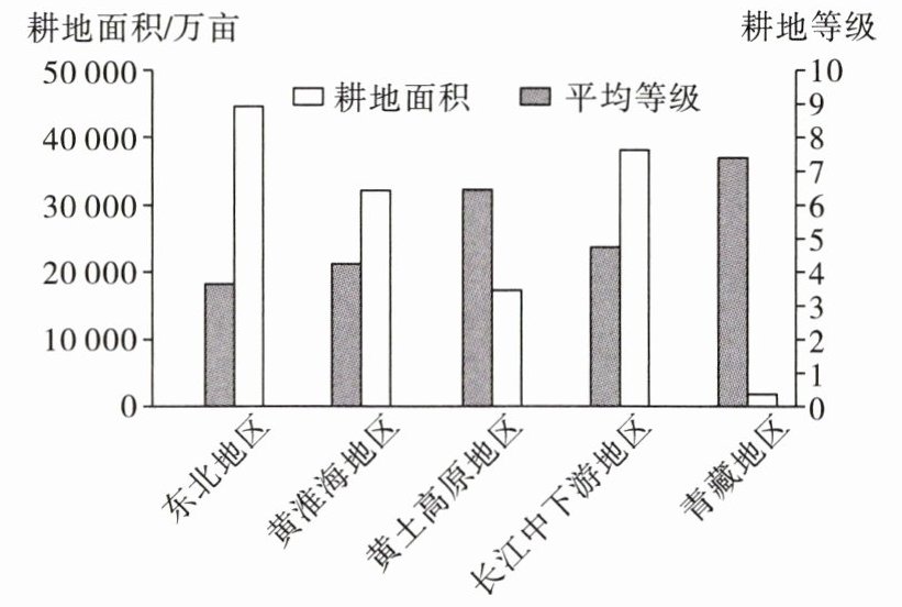 下图为我国部分区域耕地面积及平均等级结构图,耕地等级数值越小,表示耕地质量越优。读图,完成 9~10 题。