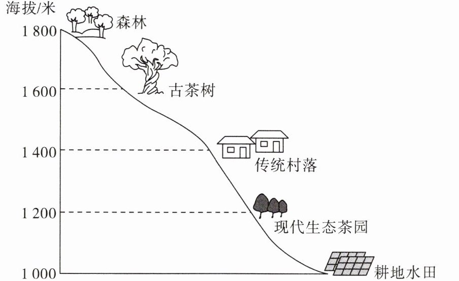 普洱景迈山的当地居民在森林间开发茶林,茶树与高大的乔木、灌木、草本植物共生,形成多层次的生态系统。下图为景迈山垂直景观示意图,据此完成 10~11 题。