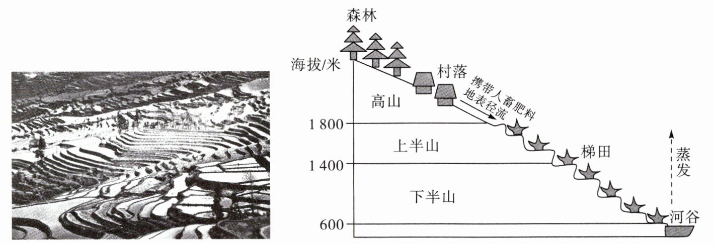 云南省红河哈尼族梯田被列入《世界遗产名录》。读哈尼梯田景观图和哈尼梯田生态系统示意图,完成 12~13 题。