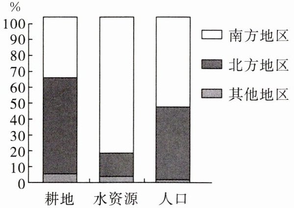 6. 读我国南、北方地区耕地、水资源和人口对比图,下列叙述正确的是(