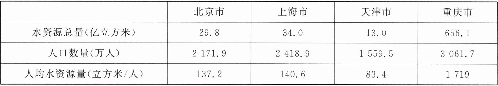 我国四个直辖市的水资源存在差异。读下表,完成5~7题。