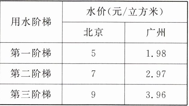 国家对我国城市居民生活用水实行阶梯水价(超定额累进加价)。下表为某年北京和广州居民生活用水价格比较表。据此完成1~2题。