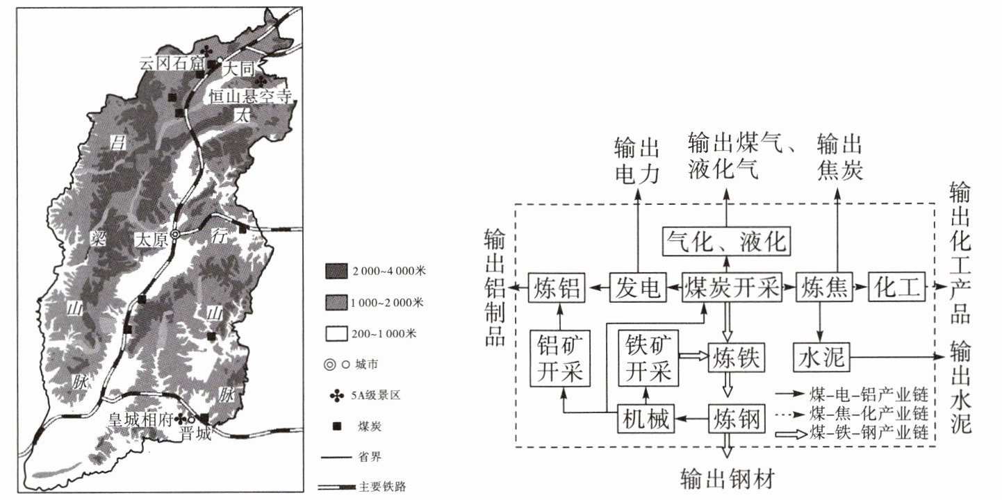 材料三 山西省地形图和煤炭产业链示意图。