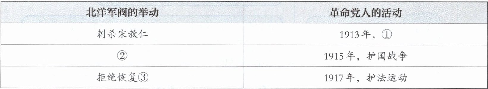 2. 下图为某班同学在学习“民国初年维护共和的斗争”时所做的学习卡片。请你帮助该同学把卡片中标注序号的空项,准确地补充完成。(