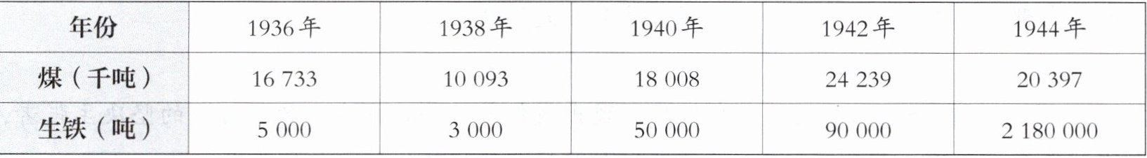 10. 下面为1936—1944年日本帝国主义掠夺下,华北煤、生铁的生产量统计表。这一状况(