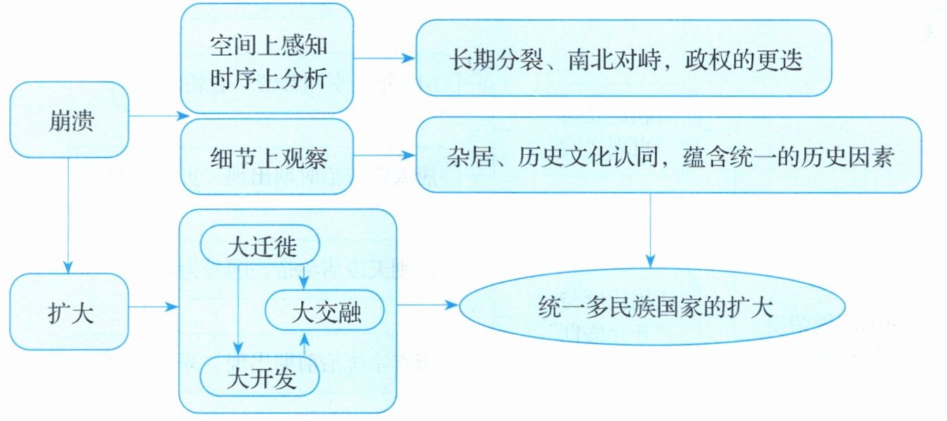 说明:魏晋南北朝时期,国家分裂、政局动荡;北方少数民族内迁,战争频繁,在推动政权更迭的同时,也促进了民族迁徙,各民族杂居生活,有利于民族交融;北魏孝文帝改革,推行汉制、发展经济,迁都洛阳、移风易俗;北方经济获得发展,各民族交融加速,为隋唐统一奠定了基础;中原地区人口大量南迁,促进了南方地区的开发和民族交融,对统一多民族国家的发展有推动作用。