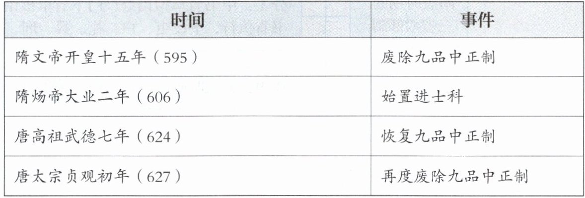 【解析】本题考查隋唐时期的选官制度的发展——九品中正制到科举制。从表格信息看,从595年废除九品中正制,到624年恢复九品中正制,中间相隔近30年,这期间实行的是科举制,世家大族垄断官场的局面逐渐改变,所以尽管624年重新恢复了九品中正制,但也只延续了3年的时间,最终还是于唐太宗贞观初年被再度废除了。这一过程本身反映了世家大族地位下降的趋势,故选A项。
