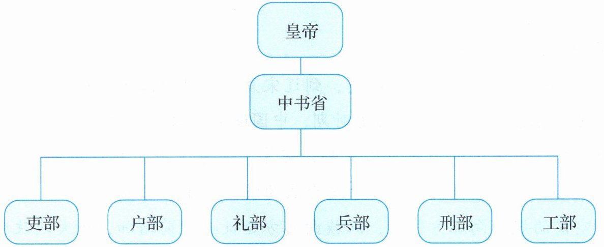 6.B 【解析】本题通过示意图的形式考查同学们对元朝中央官制的认知情况。根据材料并结合所学知识可知,元朝设中书省替代前代的三省,六部也归入中书省,中书省的长官行使宰相的职权,总领政务,故B项符合题意。A项描述的是唐朝门下省的职权;C项描述的是元朝宣政院的职权;D项描述的是元朝刑部的职权。本题应选B项。