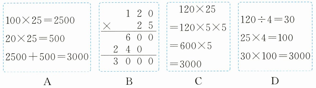 3. 计算120×25时有以下4种不同的方法,其中利用“积的变化规律”进行计算的是(