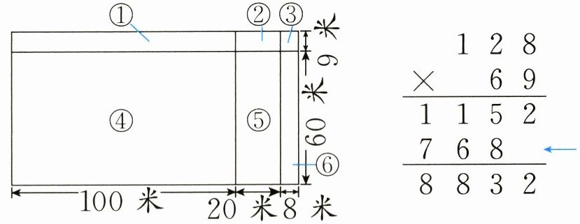 4. 如图,一个长方形花园长128米,宽69米,小丽列竖式计算出花园的面积,箭头所指的这一步算的面积是(