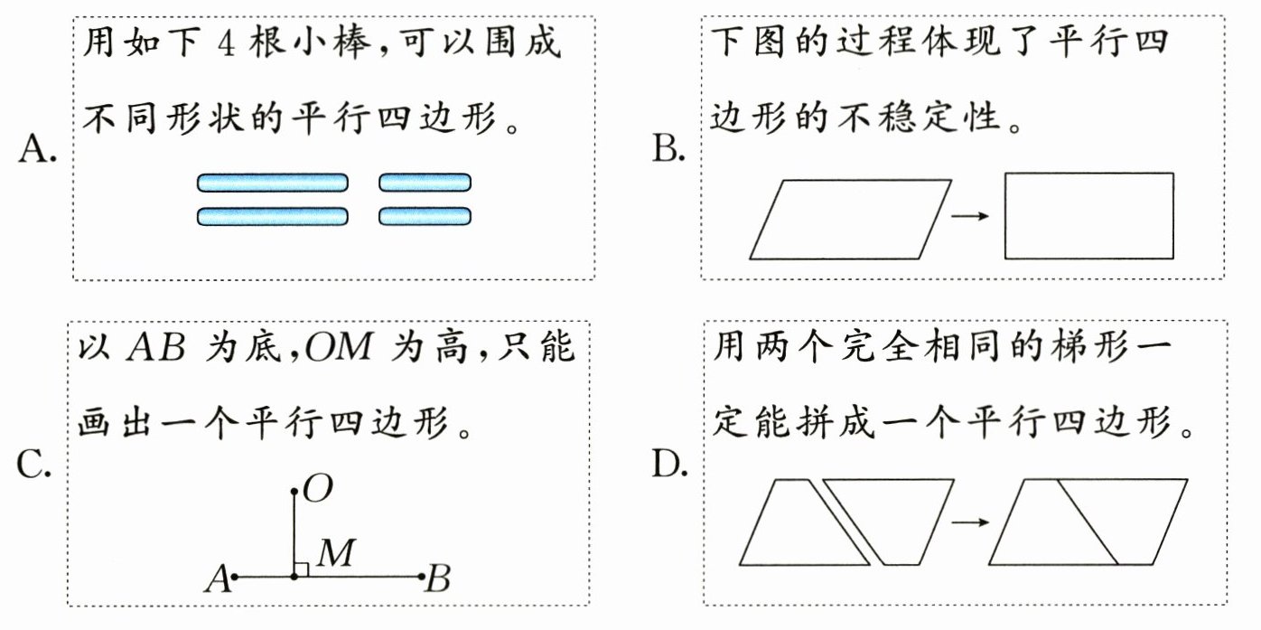 )A.用如下4根小棒,可以围成不同形状的平行四边形。