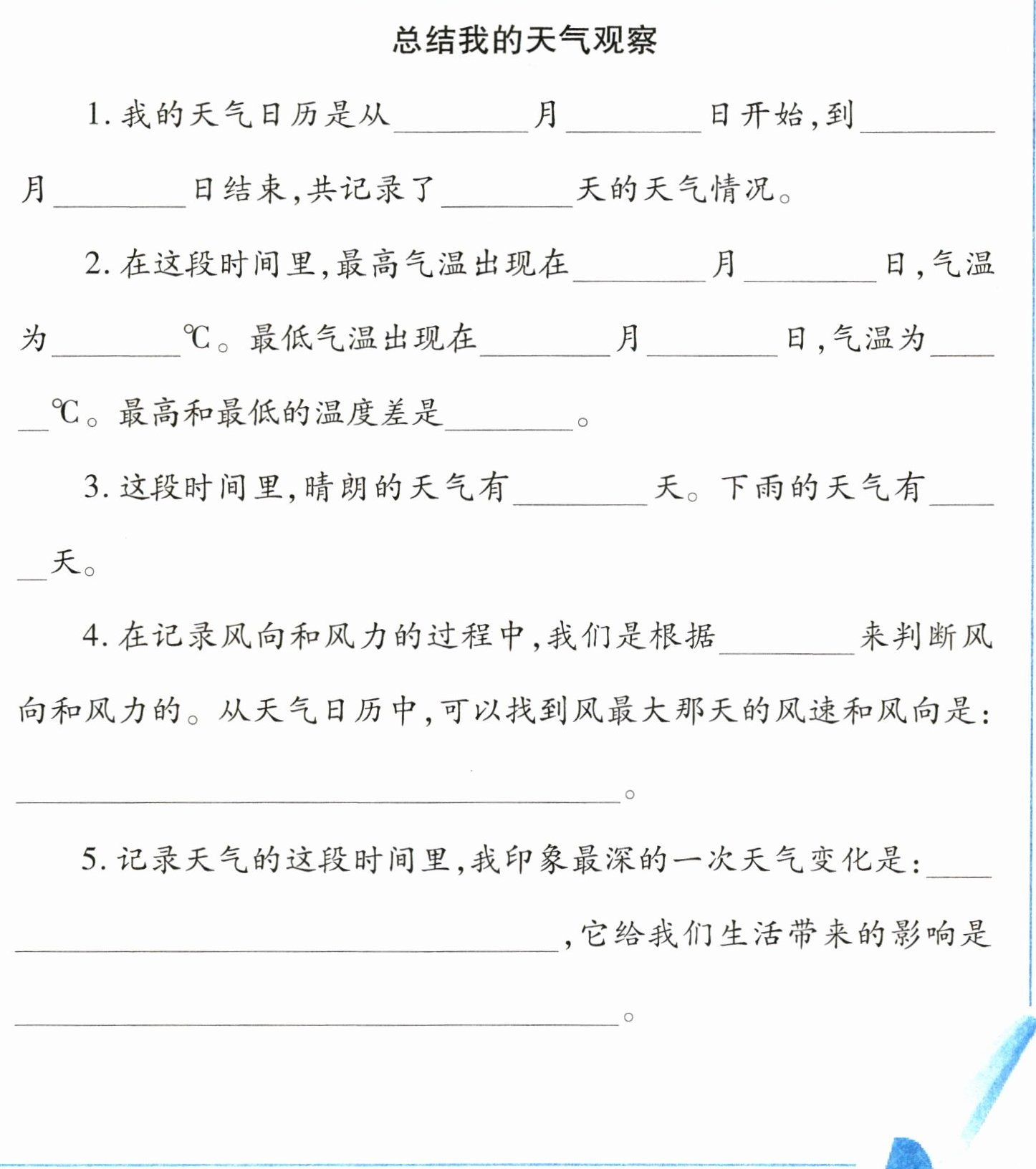 4. 在记录风向和风力的过程中,我们是根据来判断风向和风力的。从天气日历中,可以找到风最大那天的风速和风向是:。