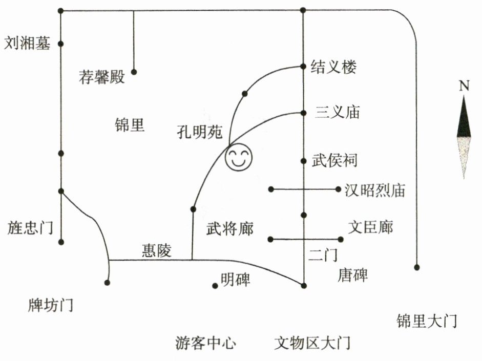 成都武侯祠是全国影响最大的三国遗迹博物馆。小明参观时,在孔明苑附近停了下来。请你仔细读图,完成以下问题: