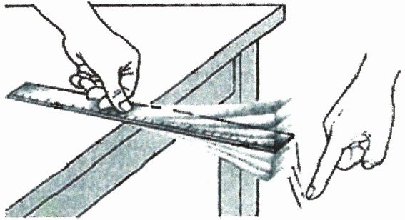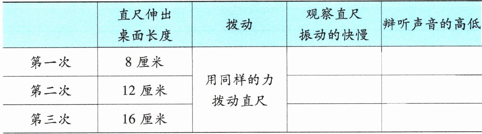 2. 研究尺子伸出桌面的长度和发出声音的音高有什么变化。实验方法是将直尺一端紧压在桌子边缘,用手拨动尺子的另一端,将观察到的现象填写在表格中。