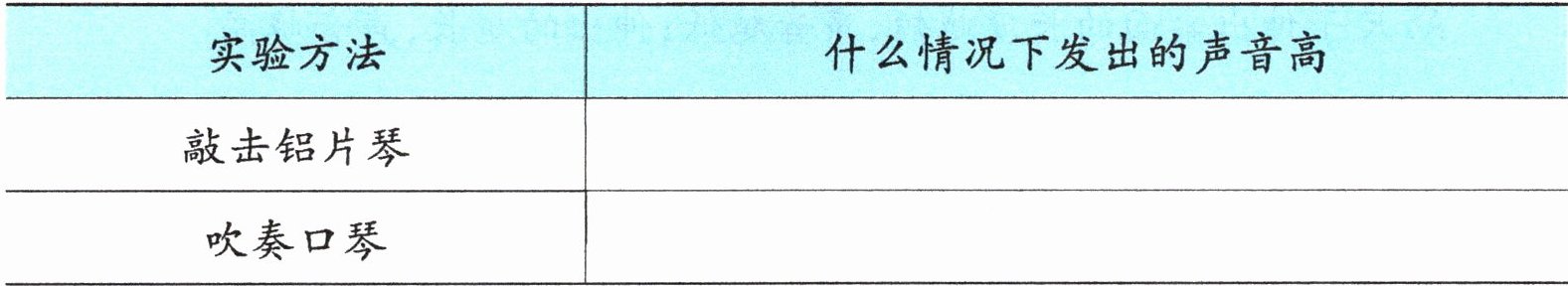 1.敲击最短的铝片,声音更高 吹奏口琴,口琴簧片越薄,声音更高