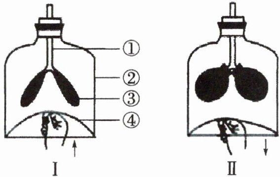1.①玻璃管模拟气管②玻璃罩模拟胸廓③气球模拟肺④橡皮膜模拟横膈膜。用手向下拉橡皮膜,空气进入使气球变大,模拟吸气。用手向上挤压橡皮膜,气球排出空气变小,模拟呼气。这个模拟实验模拟的是人体吸气和呼气的过程,这是由于人体肺部扩张收缩使肺内气压减小和增大。