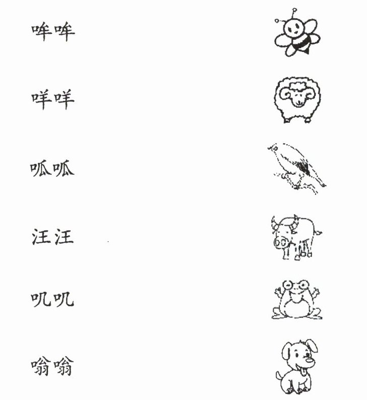 下面这些词语是描述动物叫声的词,你能分辨出是描述哪些动物发出的声音吗?请连一连。
