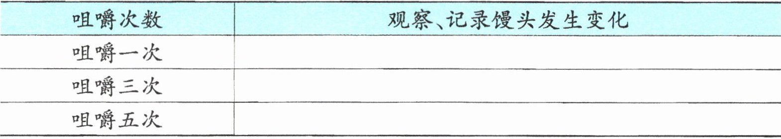 将馒头在嘴里咀嚼三次,观察、描述馒头发生的变化。