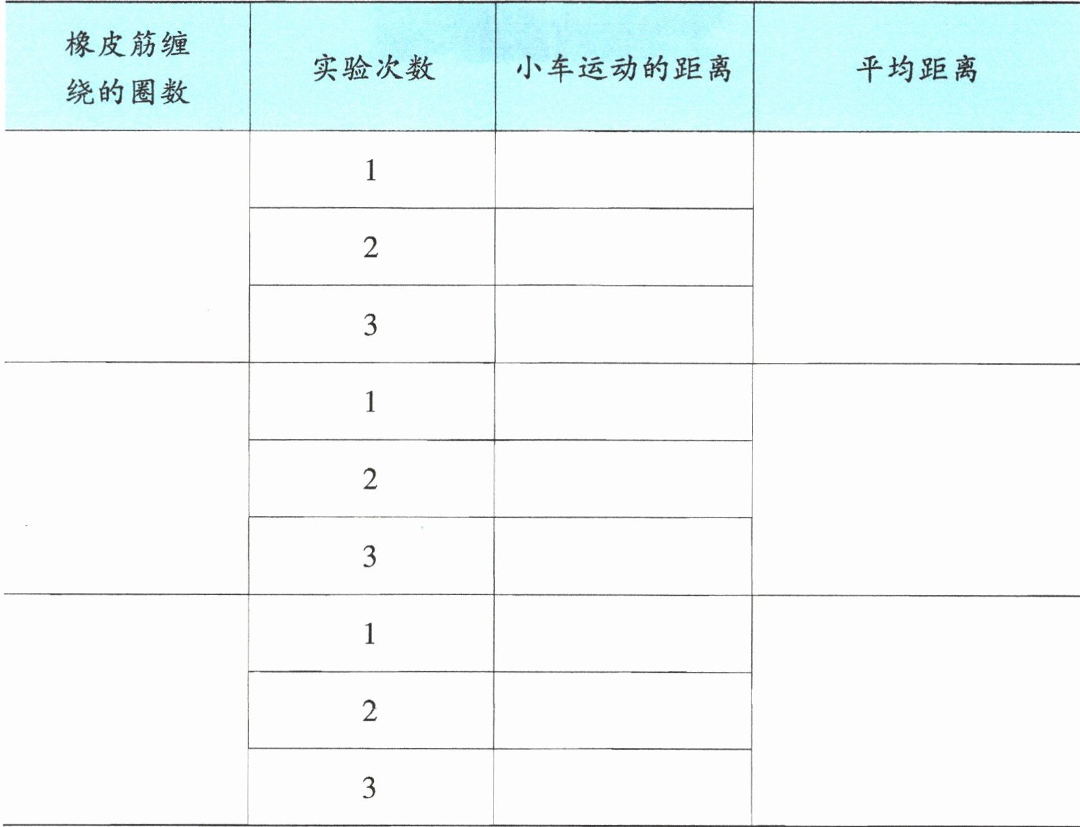 。2. 橡皮筋缠绕圈数与小车行驶距离关系的实验记录