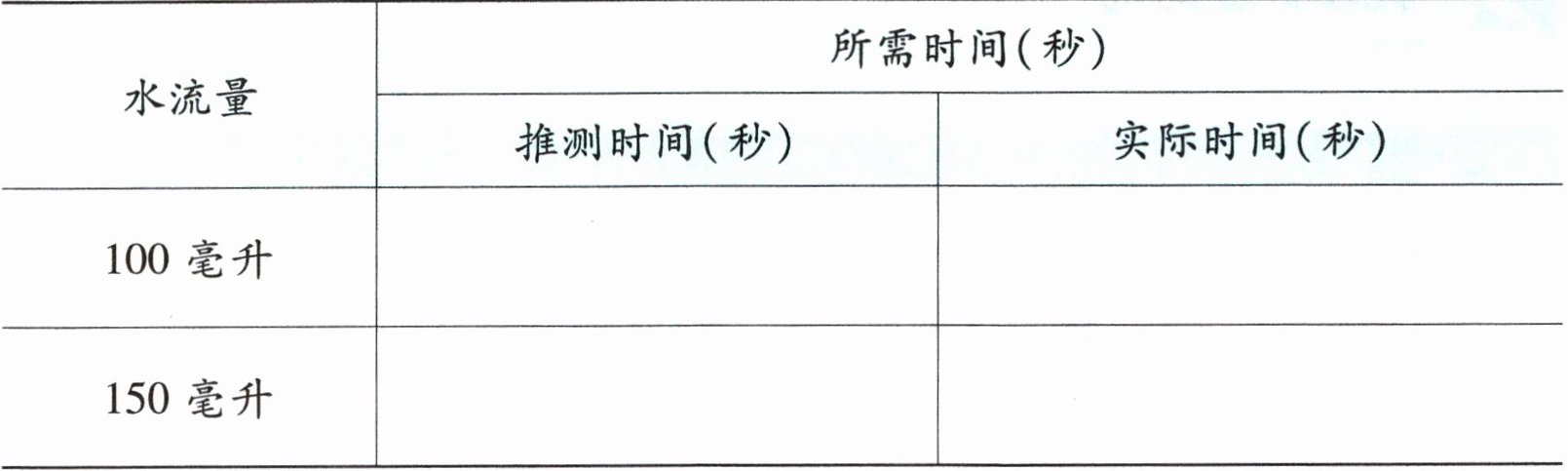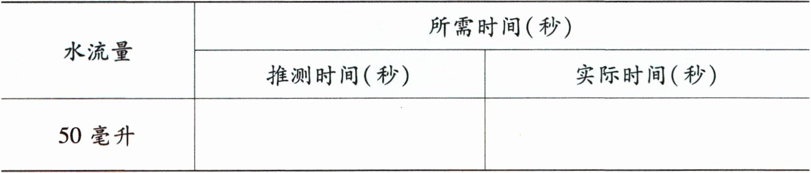 2. 小明用一个瓶子装入 200 毫升水,让瓶中水分三次连续流出,每次流出 50 毫升,分别测量其时间,发现三次所需时间(