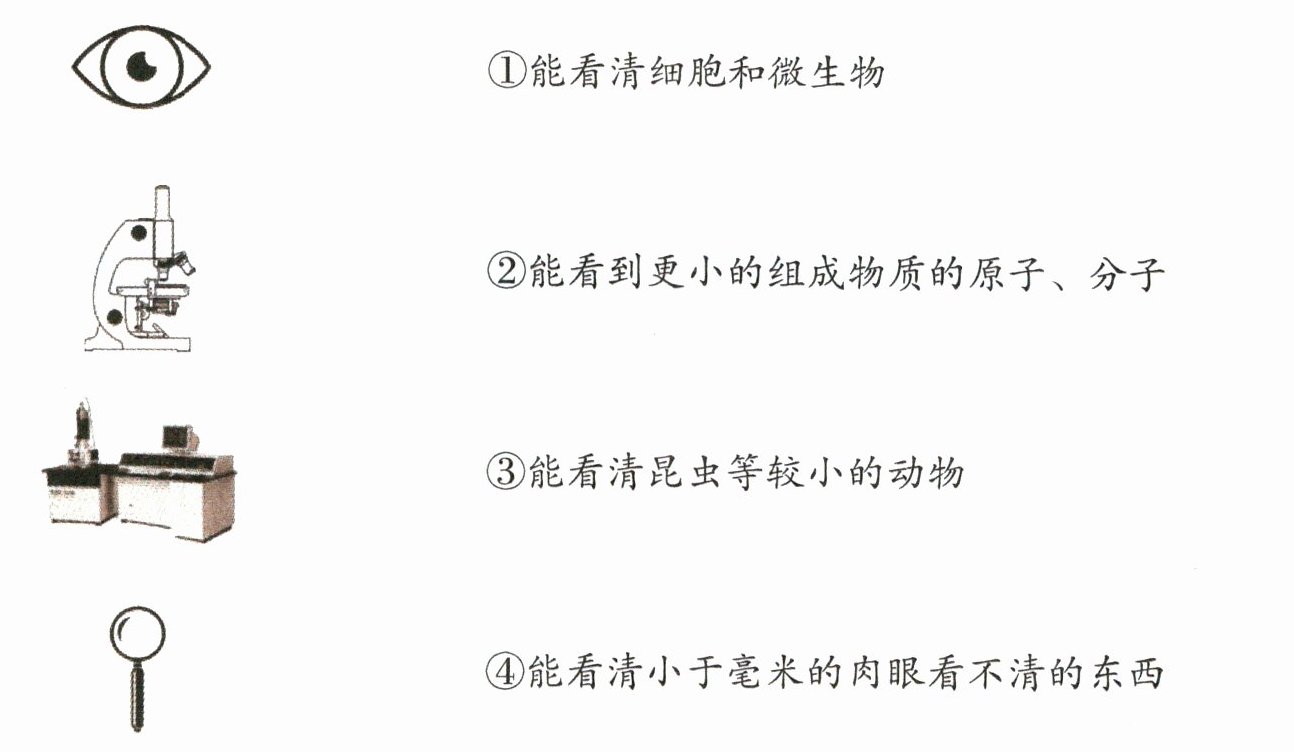 1. 眼睛—③ 显微镜—① 电子显微镜—② 放大镜—④