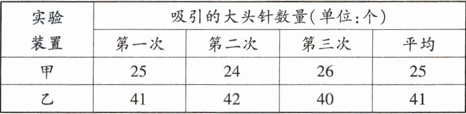 (3) 科科感觉新装的电磁锁磁性有点弱,为了增强电磁锁的磁性,科科利用同等原理的电磁铁开展了探究。实验方法如下图所示,结果如下表所示。