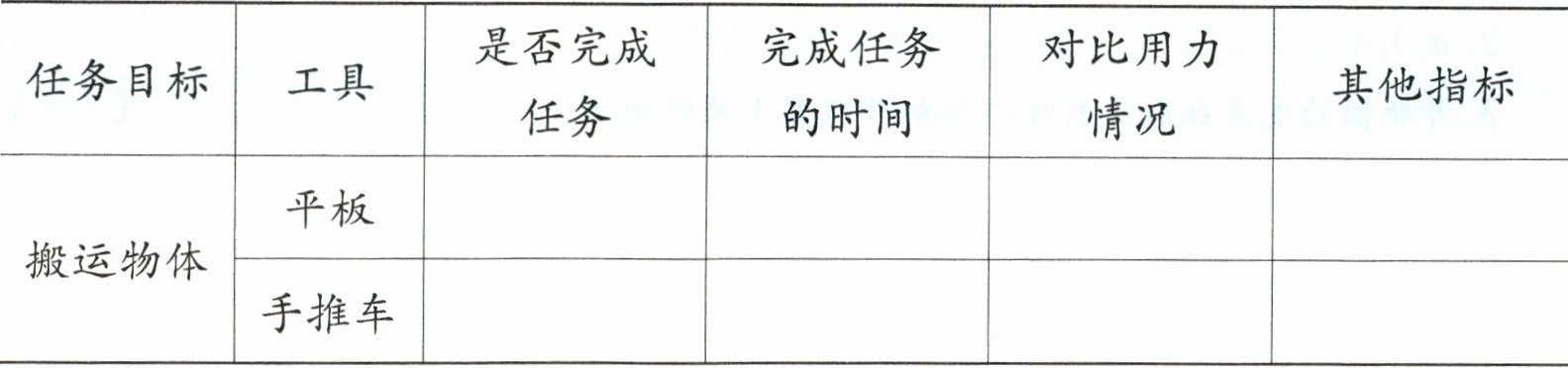 | 搬运物体 | 手推车 | 是 | 较快 | 用力较少 | 灵活性较好 |