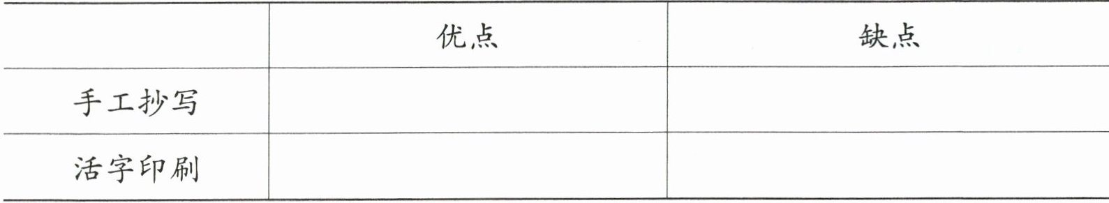 3. 通过评测,你发现活字印刷与手工抄写比较有哪些优缺点?请罗列在表格中。