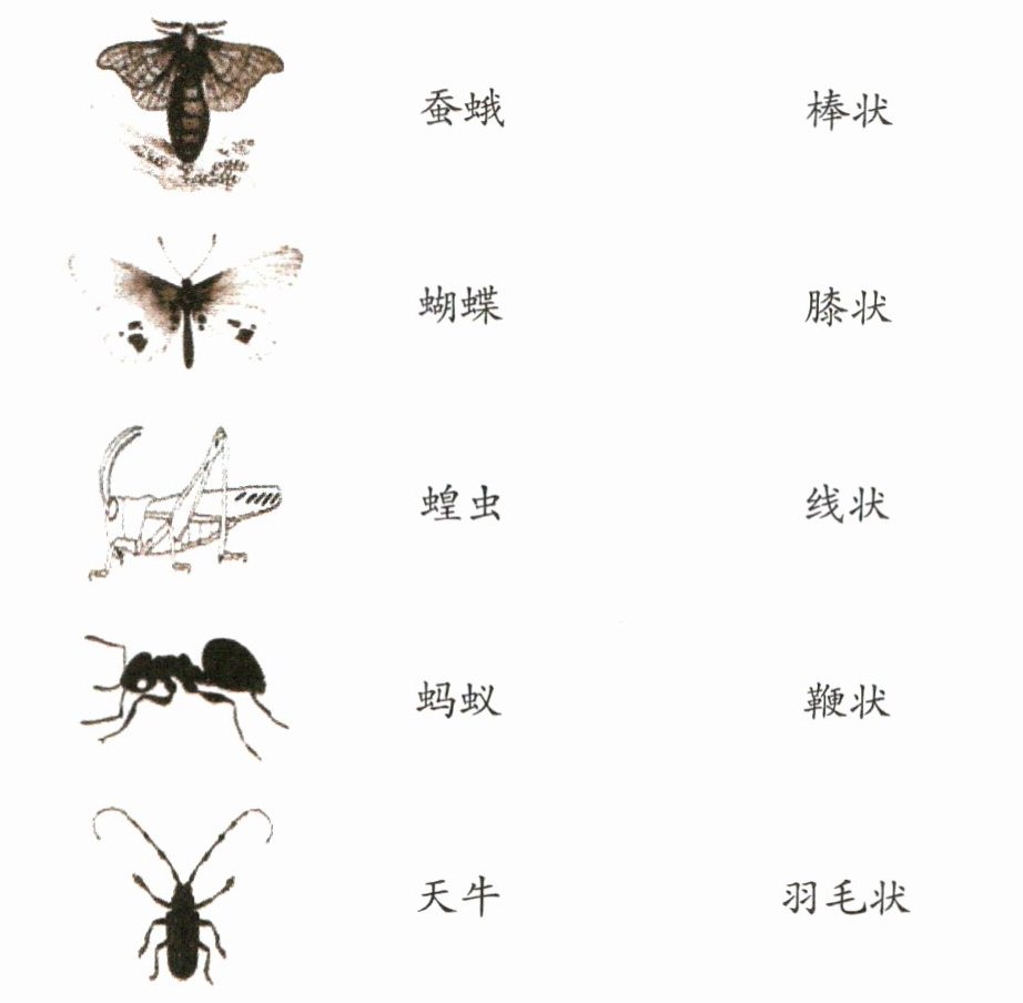 蚕蛾——羽毛状 蝴蝶——棒状 蝗虫——线状 蚂蚁——膝状 天牛——鞭状