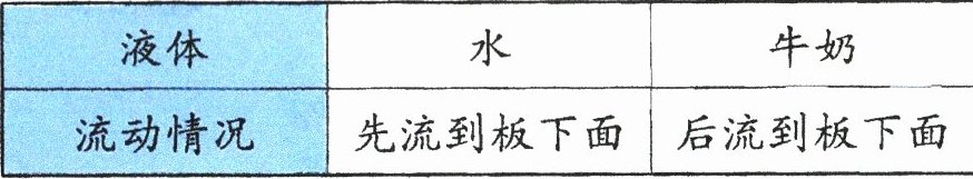 2. 为了比较出水和牛奶的黏稠度,科科把它们同时缓慢倒在光滑的塑料板上(如图),实验记录如下。从实验记录看,