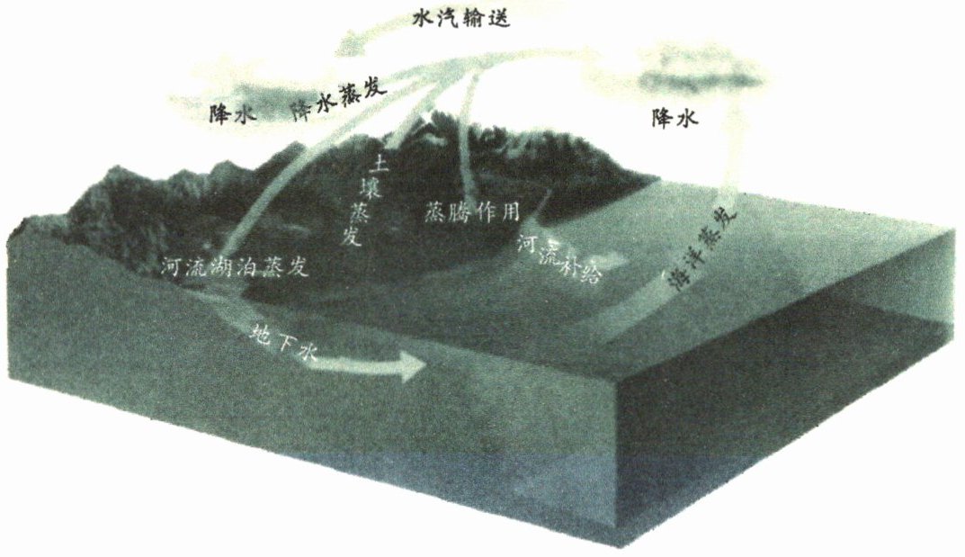 1. 在太阳的辐射作用下,、、、中的水通过蒸发进入大气圈成为大气水,大气水在重力作用下以(包括降雨和降雪)形式落回地球表面后渗入地下,进入土壤和岩体,形成了。