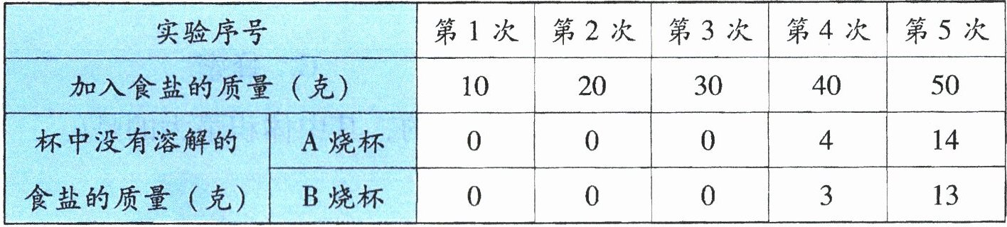 科科往 A、B 两个盛有 100 毫升水的烧杯中分别加入食盐(如下图),得到如下实验结果。请根据实验数据,回答问题。