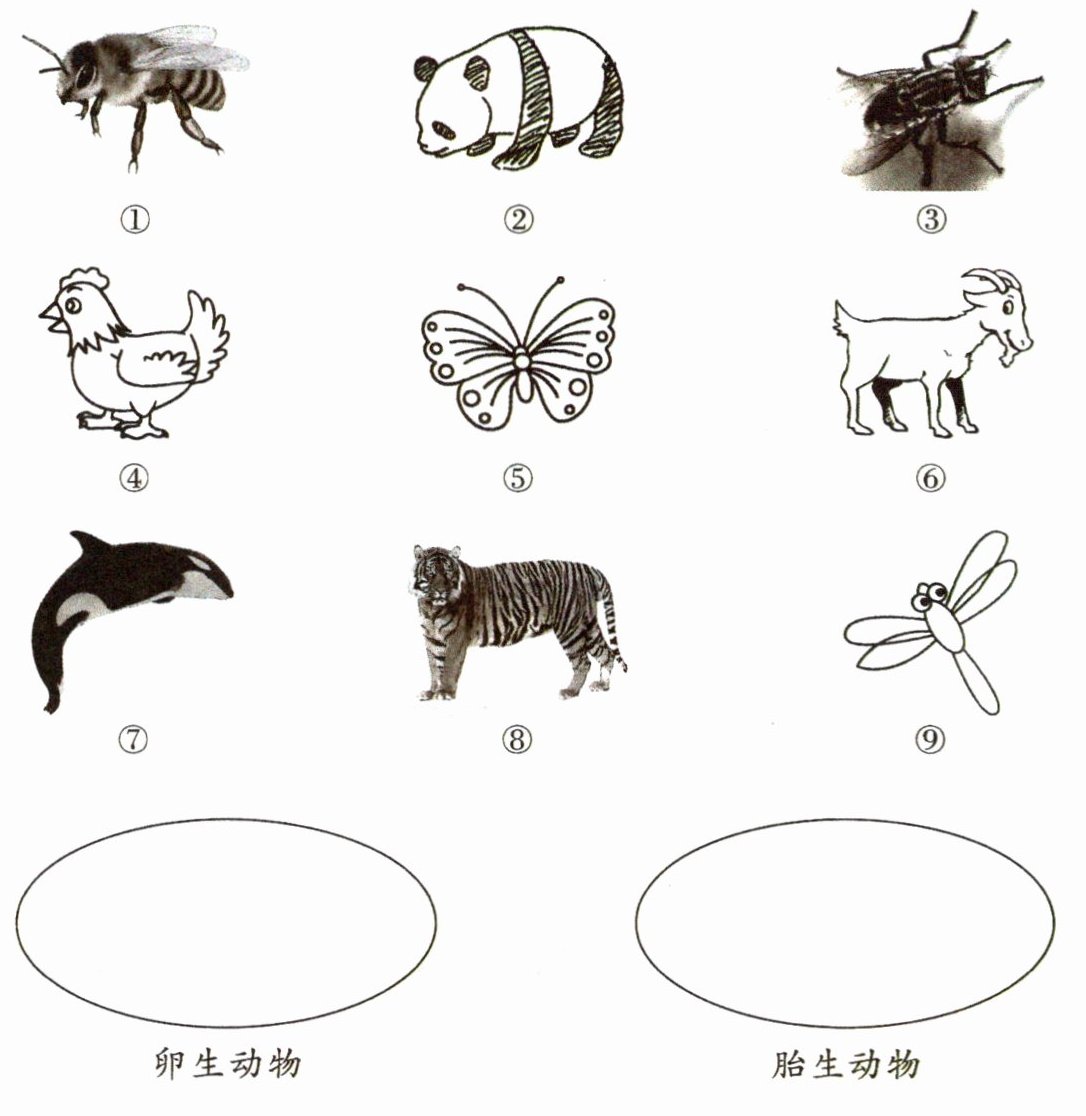 卵生动物:①③④⑤⑨ 胎生动物:②⑥⑦⑧