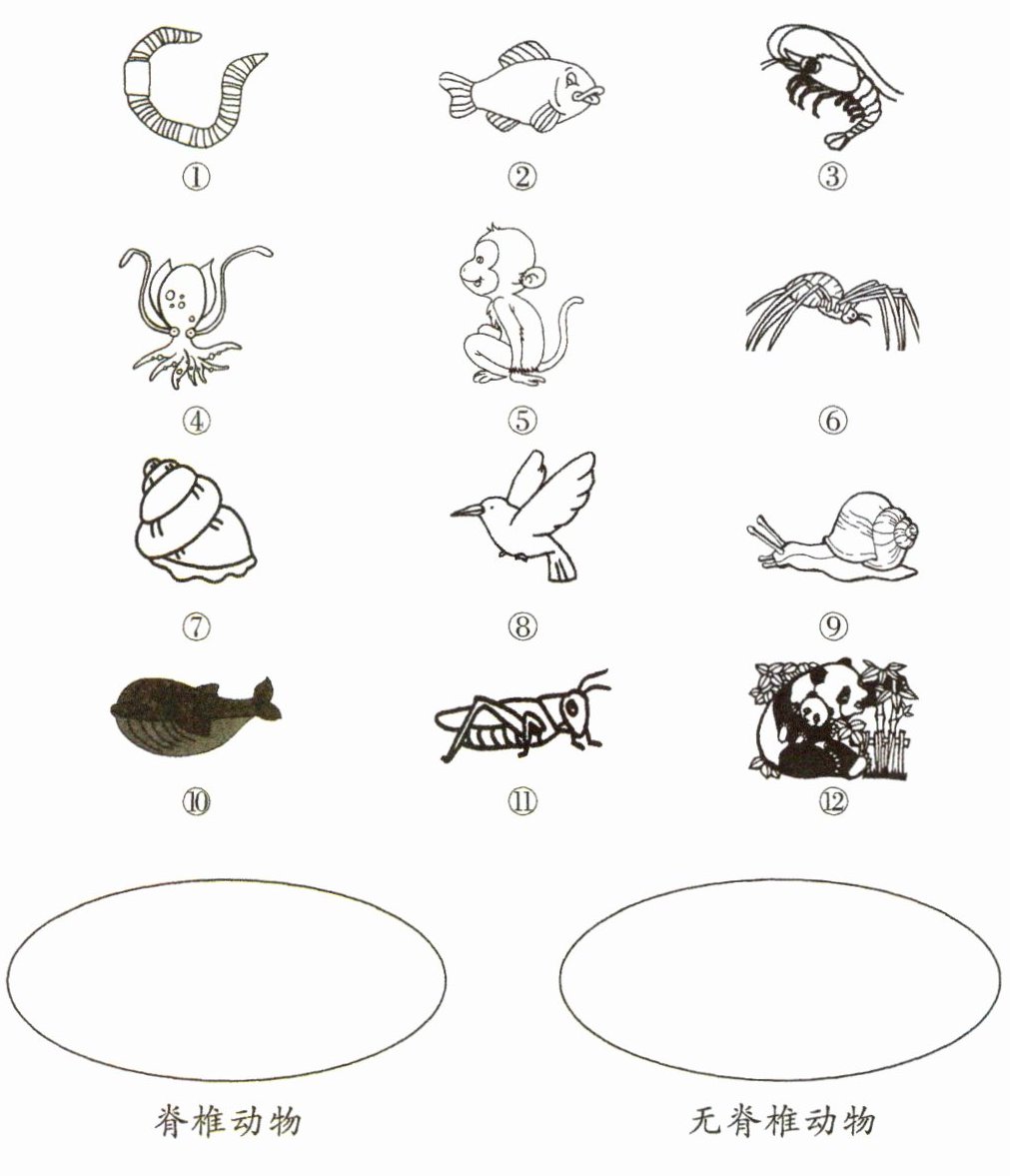 三、脊椎动物:②⑤⑧⑩⑫ 无脊椎动物:①③④⑥⑦⑨⑪