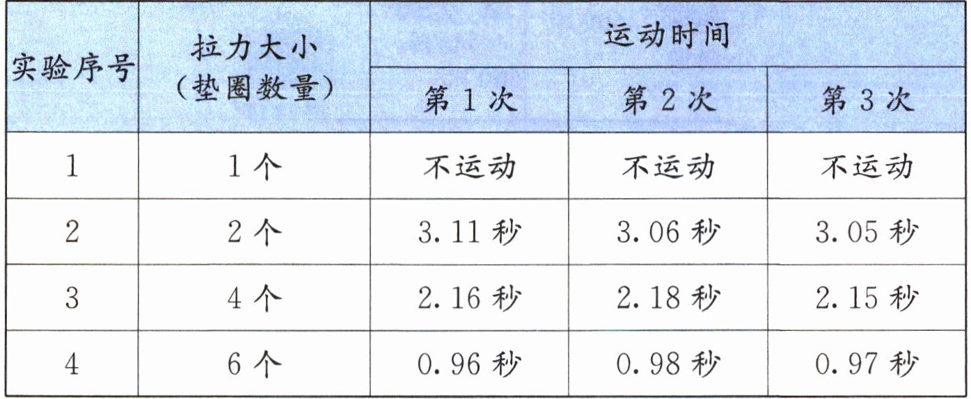 科科小组利用小车、垫圈、秒表等实验器材探究了拉力大小与小车前进快慢的关系,实验记录如下。