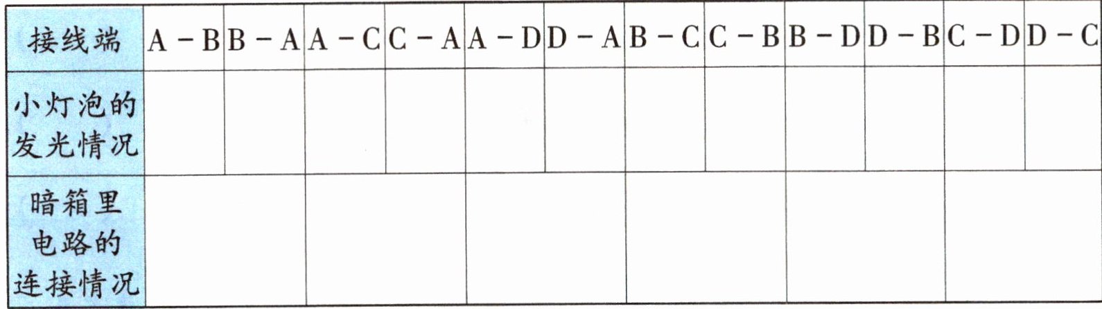 | 暗箱里电路的连接情况 | 导线连通 | 未连接(或中间断路) | 电池与导线连通(电池增强亮度) | 未连接(或中间断路) | 电池串联使电压增高亮度更大 | 导线连通 |