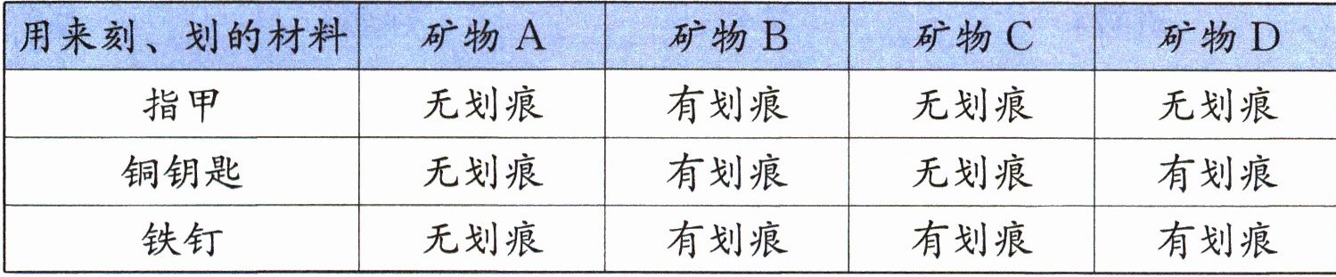 3. 为了研究矿物的特征,科科用了不同的硬物刻、划四种矿物,实验记录如下表。(10%)