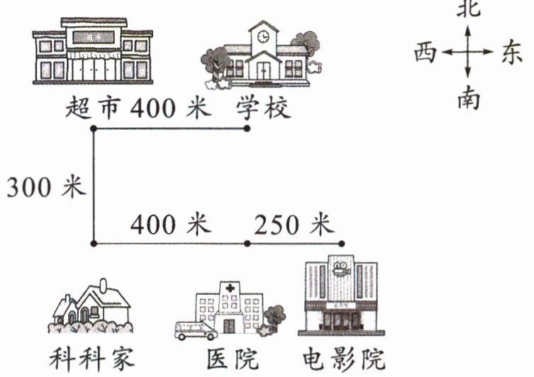 4. 科科从家出发去超市购物应该向北走300米,去医院看病应该向东走400米。