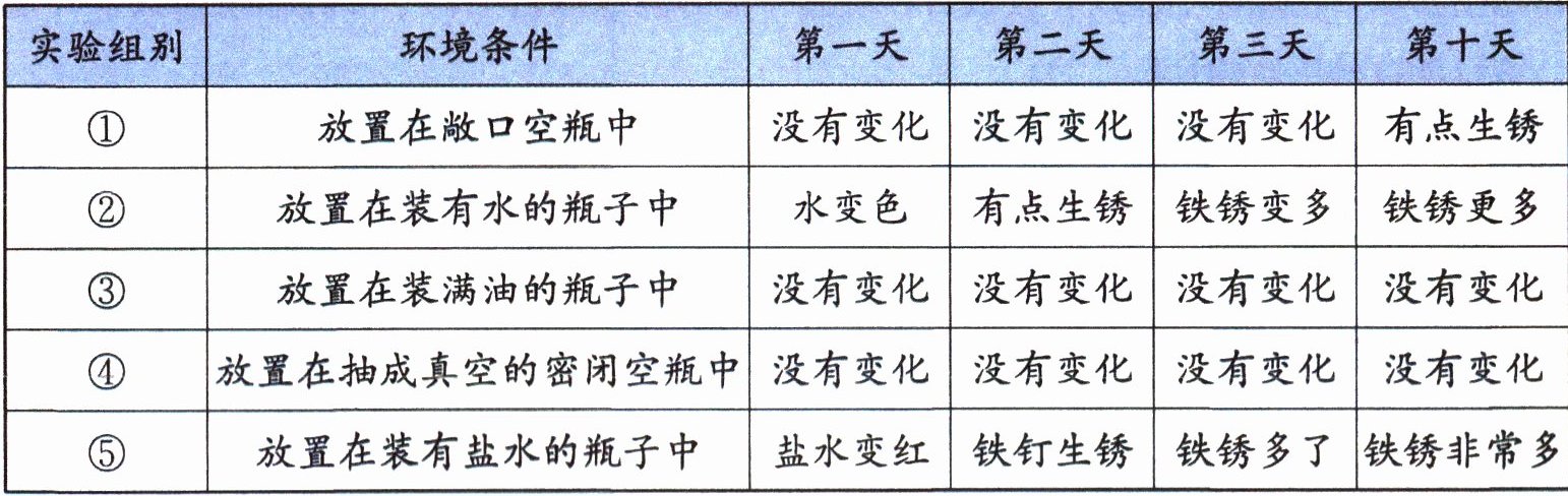 科科所在的学习小组探究了铁钉在不同环境中的生锈情况,实验记录如下。