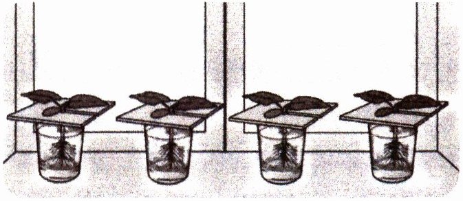步骤 1:将 4 棵长势差不多的豆苗放在 4 只杯子里,使豆苗的根完全浸入水中,并用硬纸板盖住杯口。