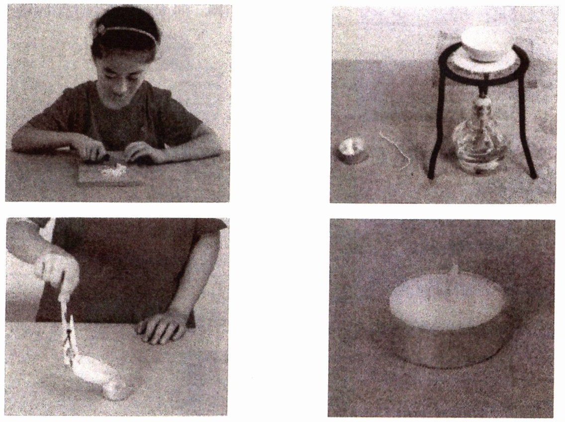 实验材料:蜡块、小刀、小木板、铝盒、棉芯、白瓷碗、石棉网、三脚架、酒精灯、火柴、试管夹等。