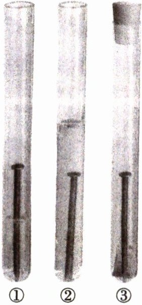 实验设计:把铁钉放在三种不同的环境中,如上图。①号试管中,铁钉一半在蒸馏水中,一半在空气中;②号试管中,铁钉完全浸入蒸馏水中,并用食用油封口;③号试管中,放有少量干燥剂和一团棉球,并用橡皮塞塞紧试管。