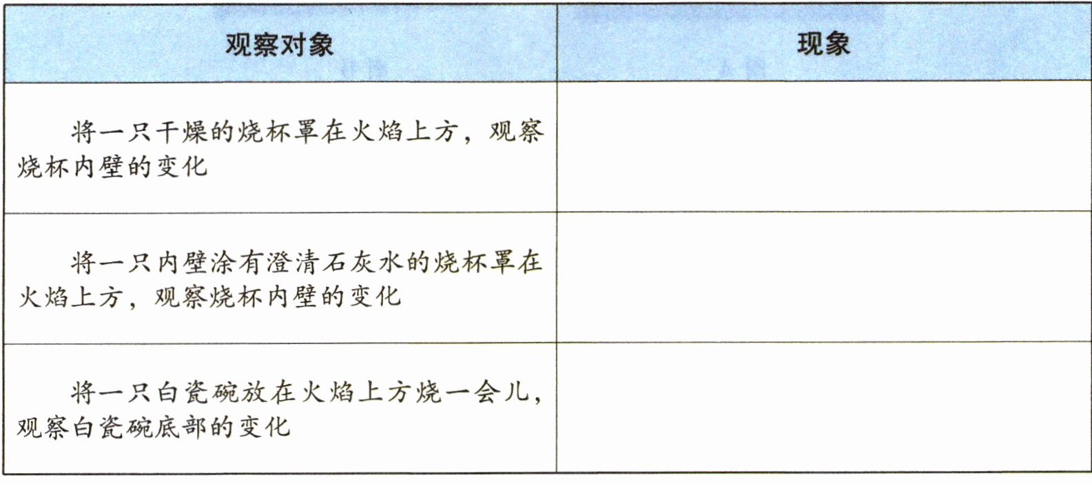 2. 点燃一支蜡烛, 把观察到的现象记录在下面的表格中。