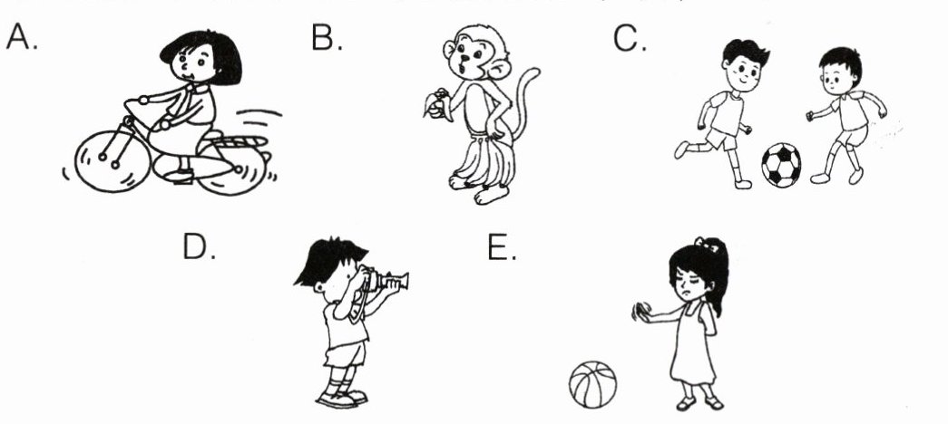 二、听录音,从下面 A、B、C、D、E 五幅图片中,按照顺序选出与你所听到的句子内容相符的图片。听完每个句子后,你将有 5 秒钟的作答时间。每个句子读两遍。(5 分)