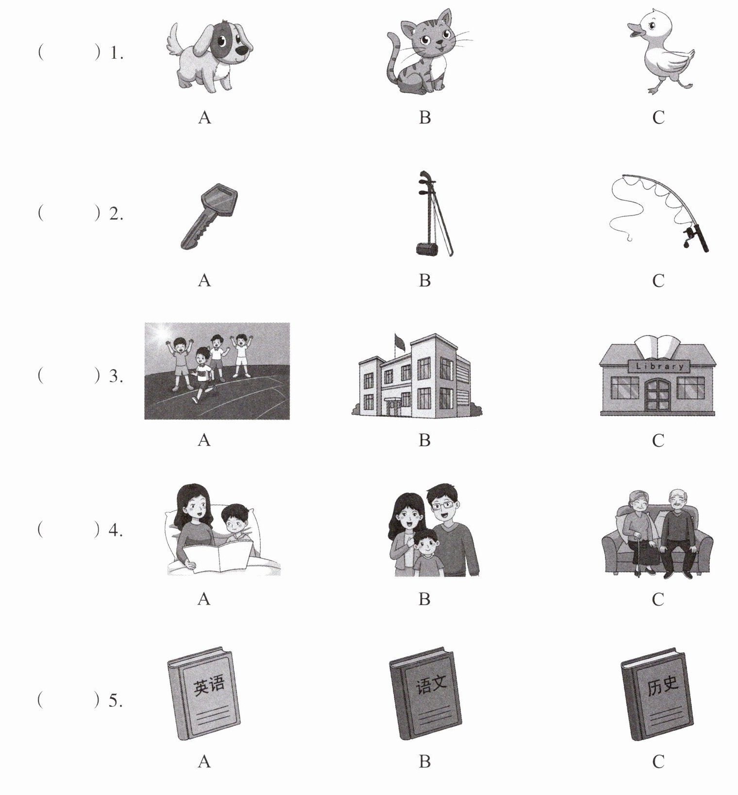听5个句子,每个句子后有一个小题,从题中所给的A、B、C三个选项中选出与所听句子内容相符的图片。每个句子听两遍。在听每个句子前,你将有5秒钟的时间阅读题目;听完后,你有5秒钟的时间作答。在听到“嘀”的信号后,进入下一小题。