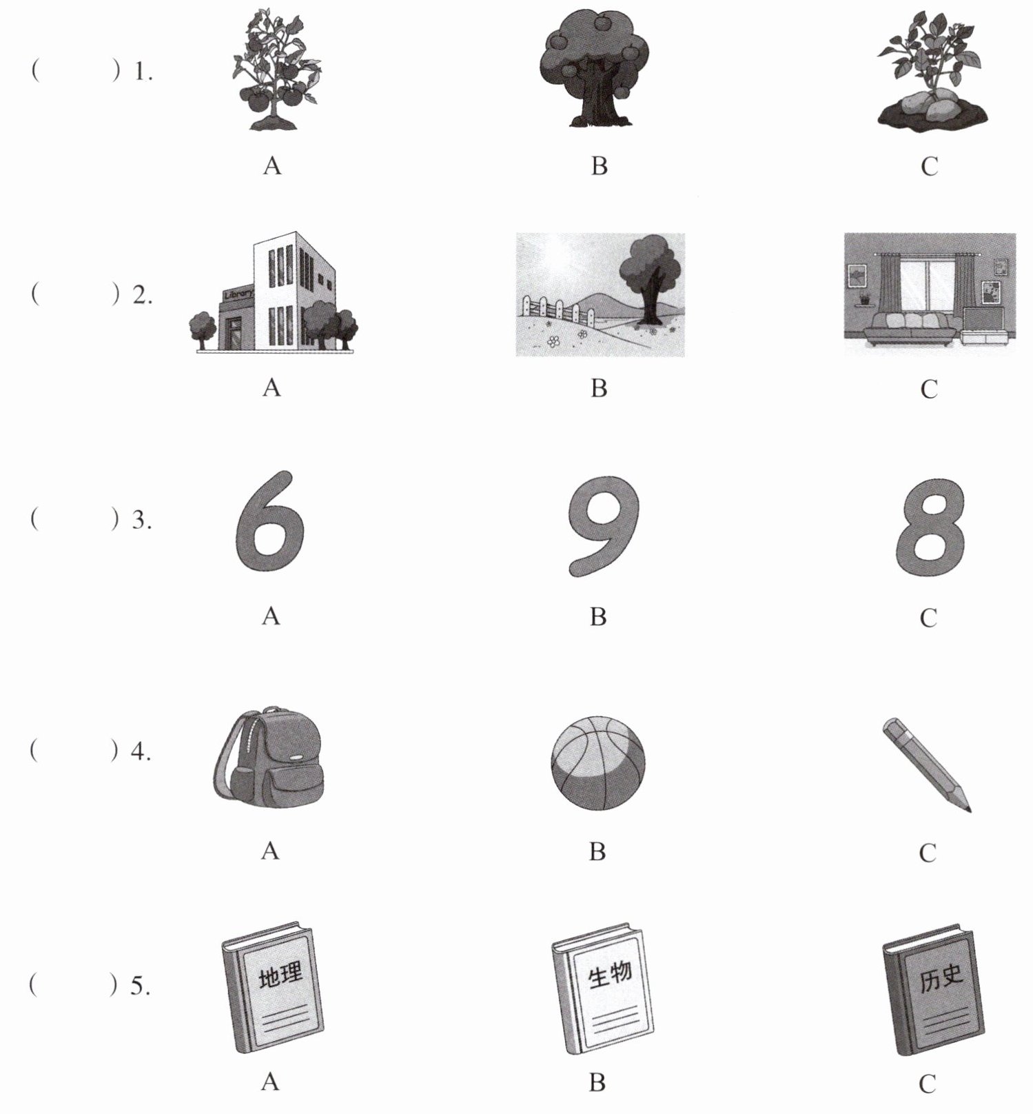 听5个句子,每个句子后有一个小题,从题中所给的A、B、C三个选项中选出与所听句子内容相符的图片。每个句子听两遍。在听每个句子前,你将有5秒钟的时间阅读题目;听完后,你有5秒钟的时间作答。在听到“嘀”的信号后,进入下一小题。