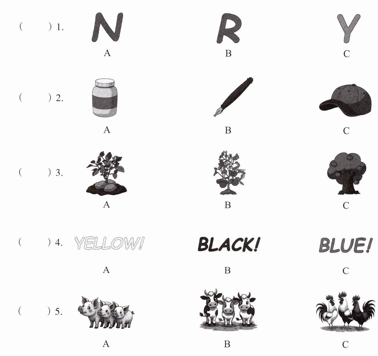 听5个句子,每个句子后有一个小题,从题中所给的A、B、C三个选项中选出与所听句子内容相符的图片。每个句子听两遍。在听每个句子前,你将有5秒钟的时间阅读题目;听完后,你有5秒钟的时间作答。在听到“嘀”的信号后,进入下一小题。