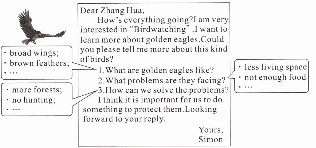 假设你是张华,你班留学生 Simon 在学习了“Birdwatching”之后,对我国的濒危鸟类金雕非常感兴趣,他写了一封邮件向你询问相关信息,请根据邮件正文内容和所给的提示给 Simon 写一封回信。